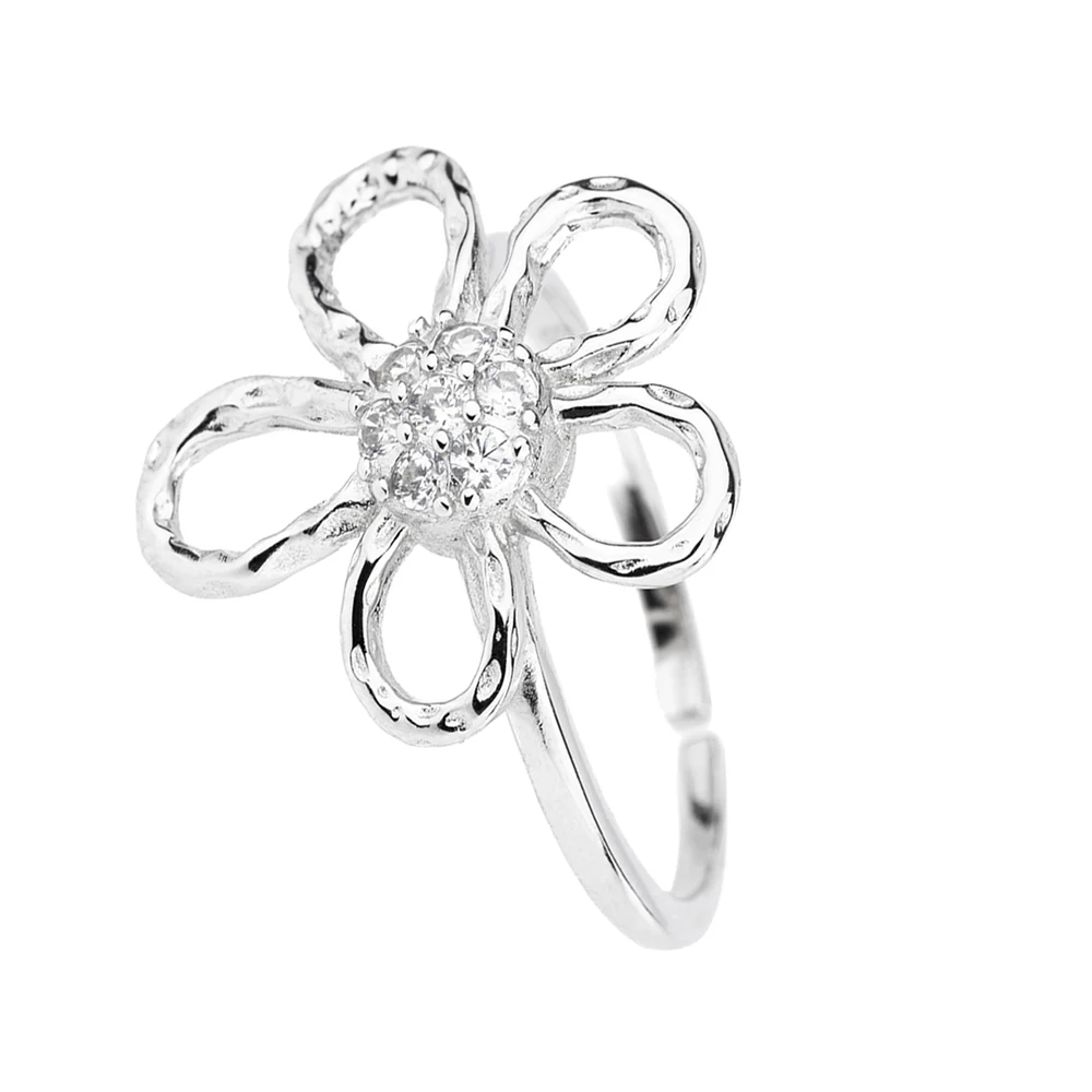 Ez az állítható gyűrű egy stilizált virágmotívumot jelenít meg, amely légies és játékos formájával természetközeli megjelenést sugall. A virág öt, szabadkézi hatású szirmából áll, amelyek finoman hullámzó kontúrokkal és szabálytalan felülettel készültek, ezzel egyedi, kézműves jellegű megjelenést biztosítanak. A középpontban apró, csillogó cirkónia kövek kaptak helyet, melyek finom ragyogással emelik ki a gyűrű részleteit. Az állítható gyűrűtest lehetővé teszi a kényelmes illeszkedést különféle ujjméretekhez. A gyűrű S925 sterling ezüstből készült, amely garantálja a minőséget és a hosszú távú fényességet. Ez a darab tökéletes választás lehet tavaszi hangulatú megjelenésekhez vagy romantikus, bohém stílus kiegészítéséhez.