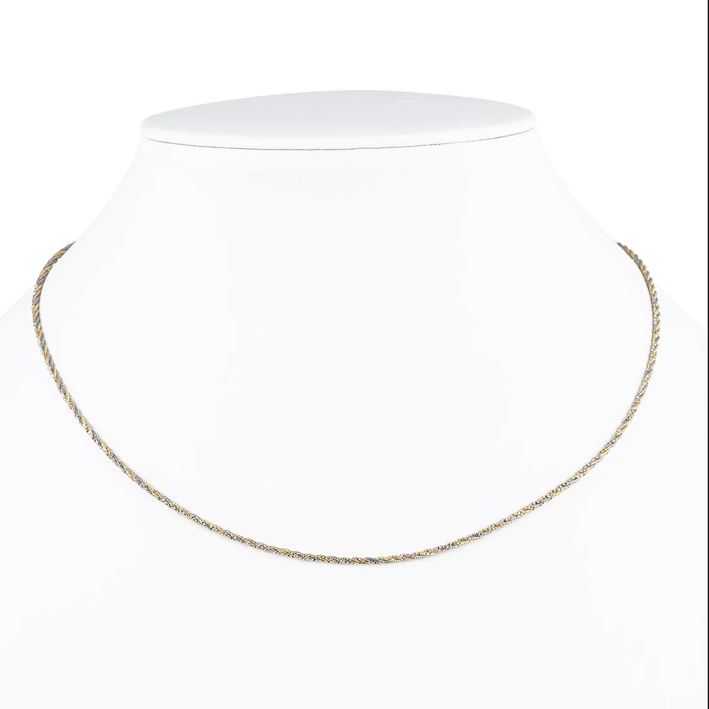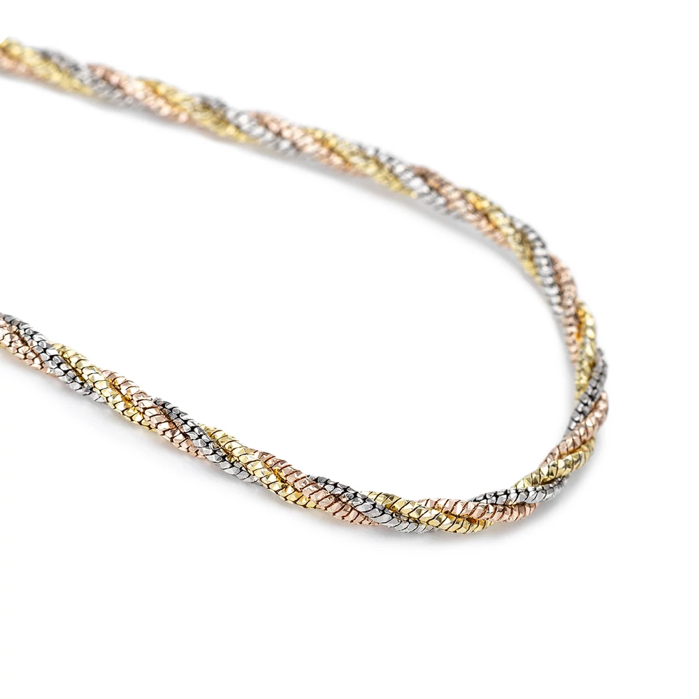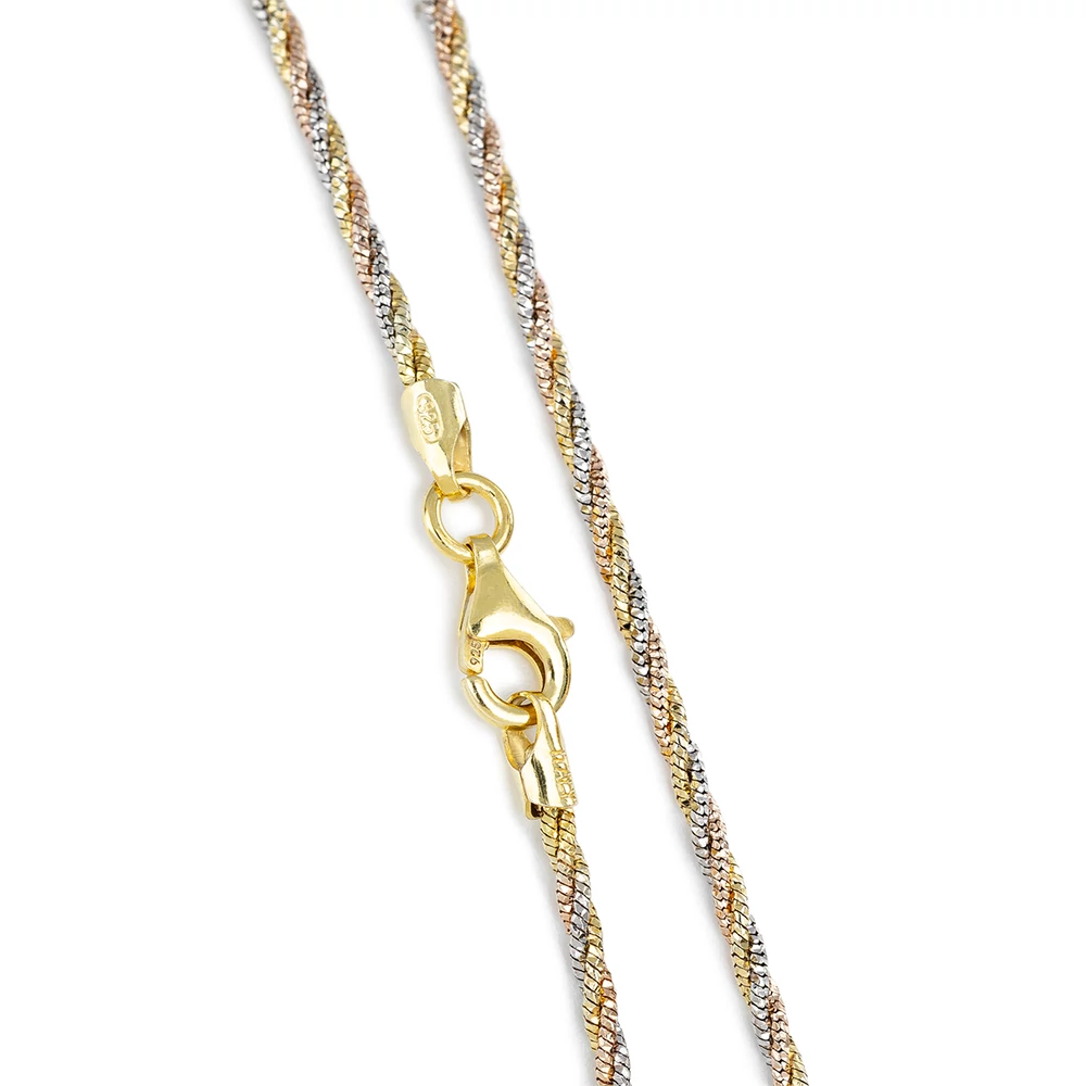 Ez a nyaklánc s925 ezüstből készült, amelyet ezüst, arany és bronz színű felületek váltakozása díszít. A sodrott, spirálisan fonott szerkezet különleges textúrát és elegáns csillogást ad a darabnak, miközben a három szín harmonikus kombinációja modern és karakteres megjelenést biztosít. A lánc erős karabiner zárral záródik, amely biztonságos és tartós viseletet garantál. Letisztult, mégis látványos kialakítása miatt önmagában is kifinomult kiegészítő, ugyanakkor más ékszerekkel párosítva is jól érvényesül.