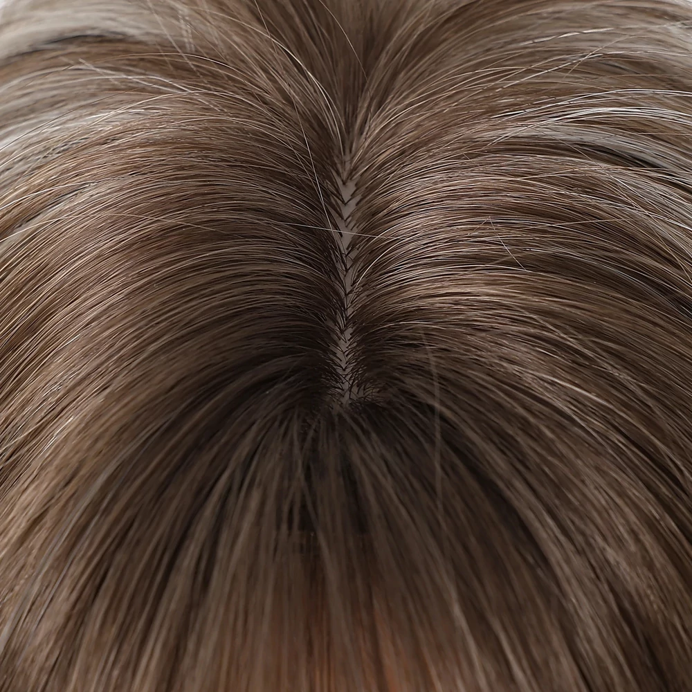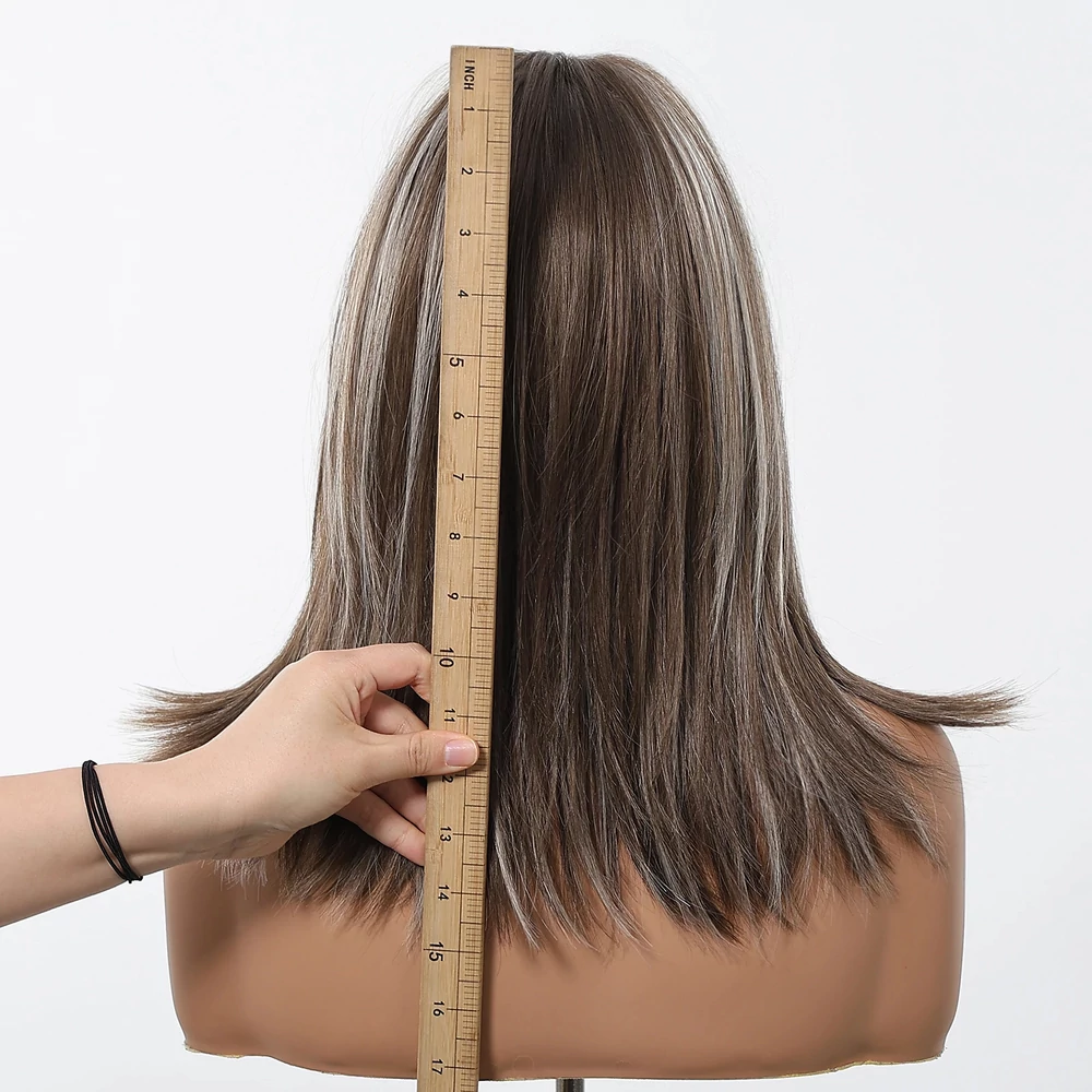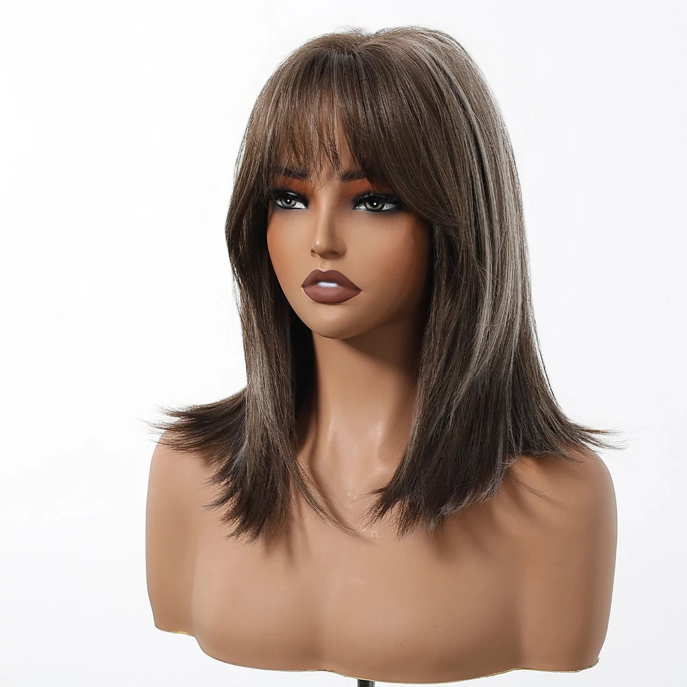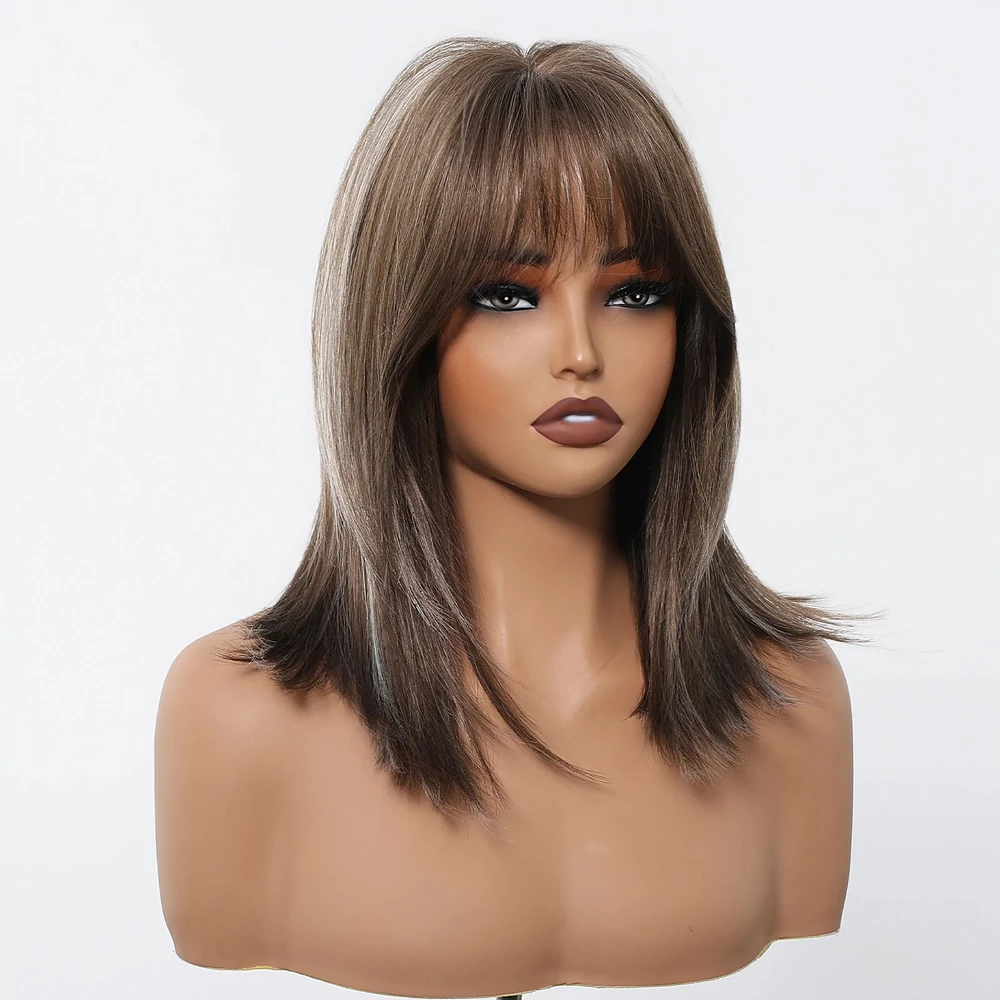 Ez egy szintetikus, vállig érő, frufrus paróka hamvas barna árnyalatban, világosabb melírral, ami természetes hatást kelt. A haj hossza körülbelül 35 cm, így ideális választás azoknak, akik könnyen kezelhető, de mégis elegáns megjelenést szeretnének. A paróka selymes, egyenes szálai lágyan keretezik az arcot, a finom frufru pedig kiemeli az arcvonásokat. A természetes elválasztású kialakítás élethű megjelenést ad, így viselés közben szinte észrevehetetlen.