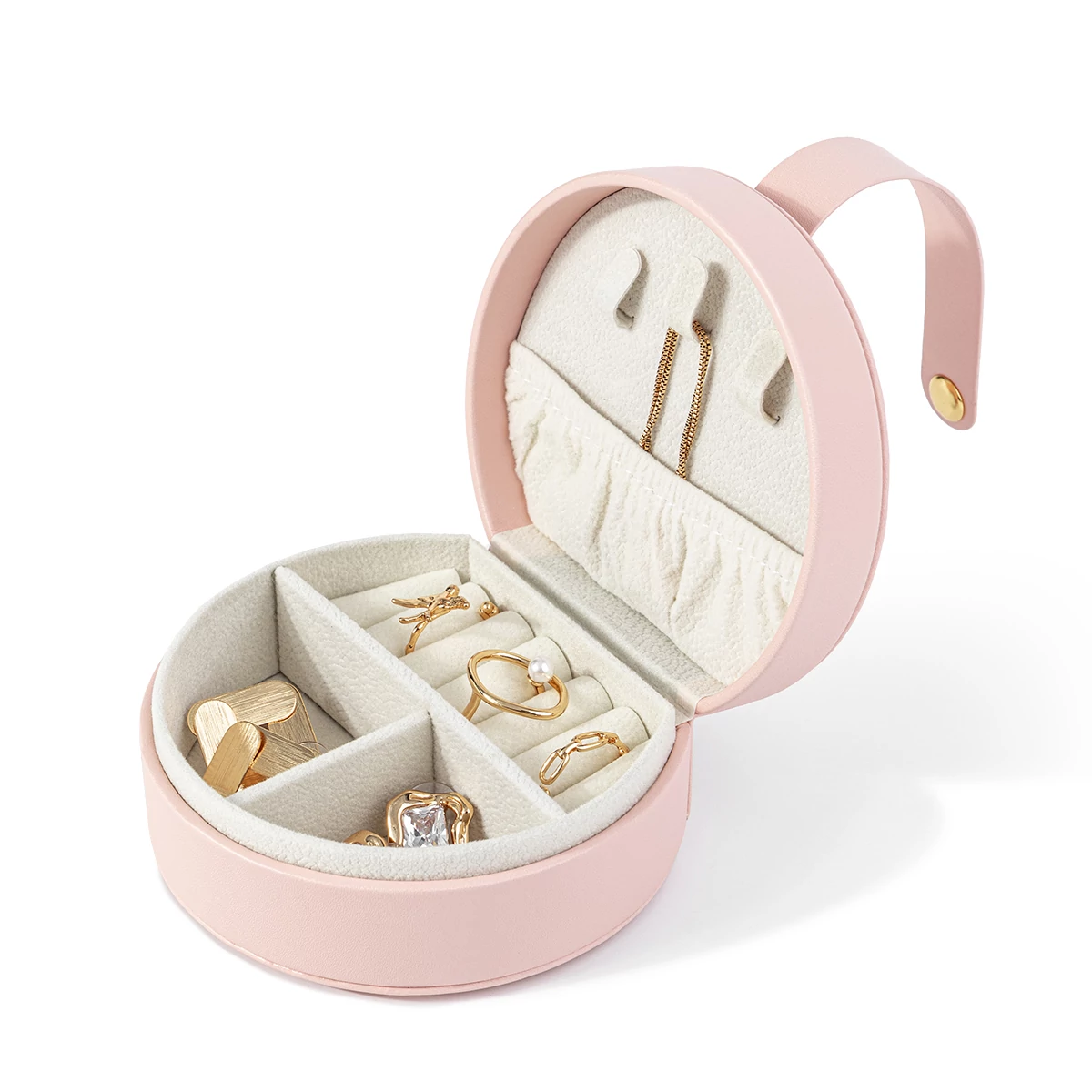 Ez a kör alakú ékszertartó doboz stílusos és praktikus megoldást kínál a kisebb ékszerek rendszerezett tárolására. Belső kialakítása gyűrűk, fülbevalók és nyakláncok elhelyezésére is alkalmas, külön rekeszeinek és gyűrűtartó részének köszönhetően.
